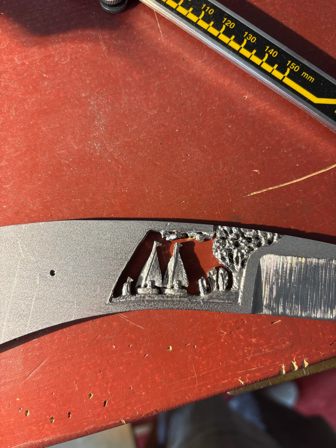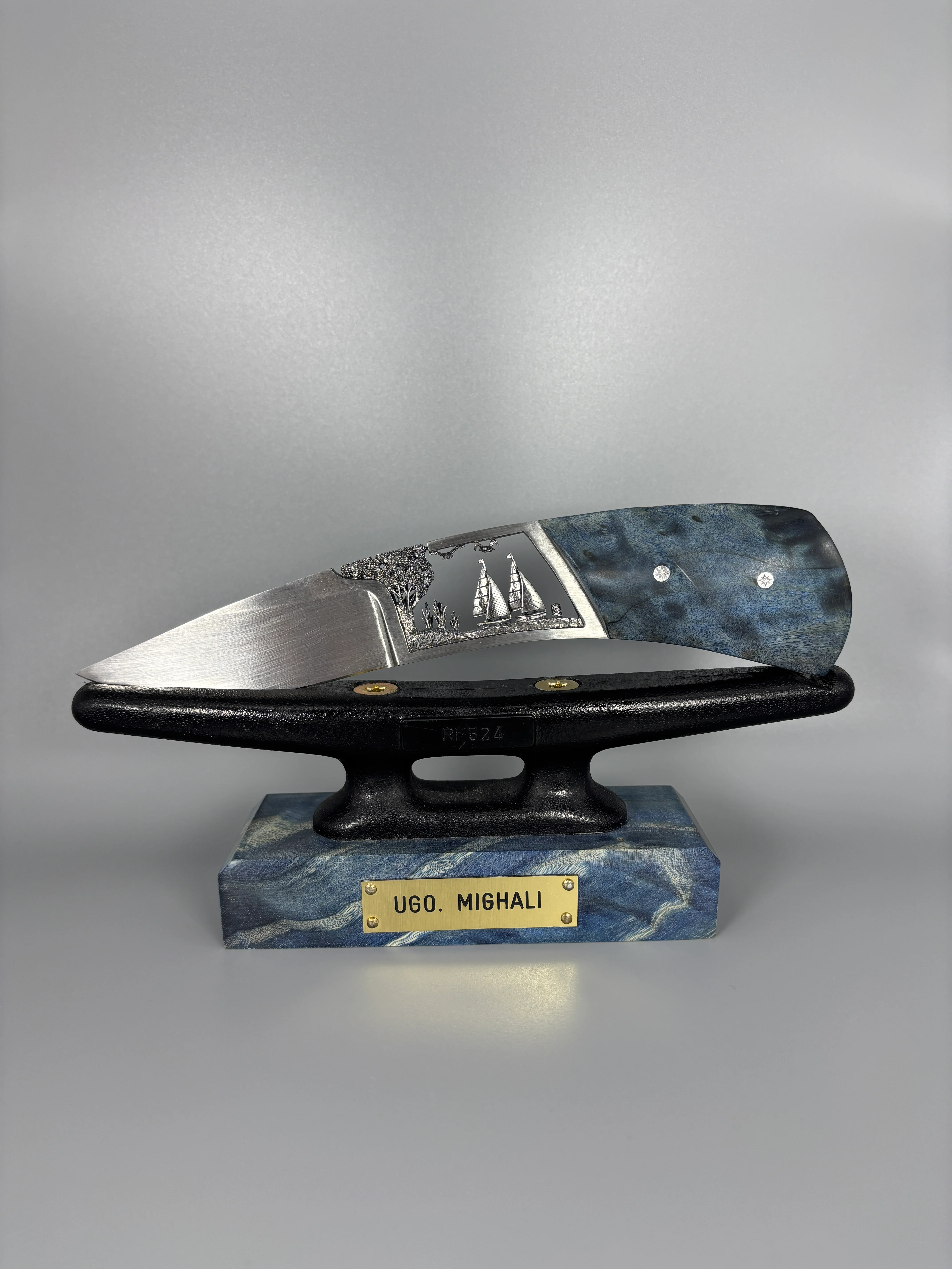 Concernant le manche, j’ai opté pour un bois stabilisé bleu marine, avec un travail de courbes rappelant les ondulations du lac de Genève, auquel j’ai voulu rendre hommage à travers cette création.